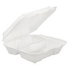Description: Foam Hinged Carryout Container, 3-Compartment, White, 9-1/4 x 9-1/4 x 3