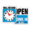 Description: Double-Sided Open/Will Return Sign w/Clock Hands, Plastic, 7-1/2 x 9