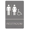 Description: ADA Sign, Restroom/Wheelchair Accessible Tactile Symbol, Plastic, 6x9,Gray/White